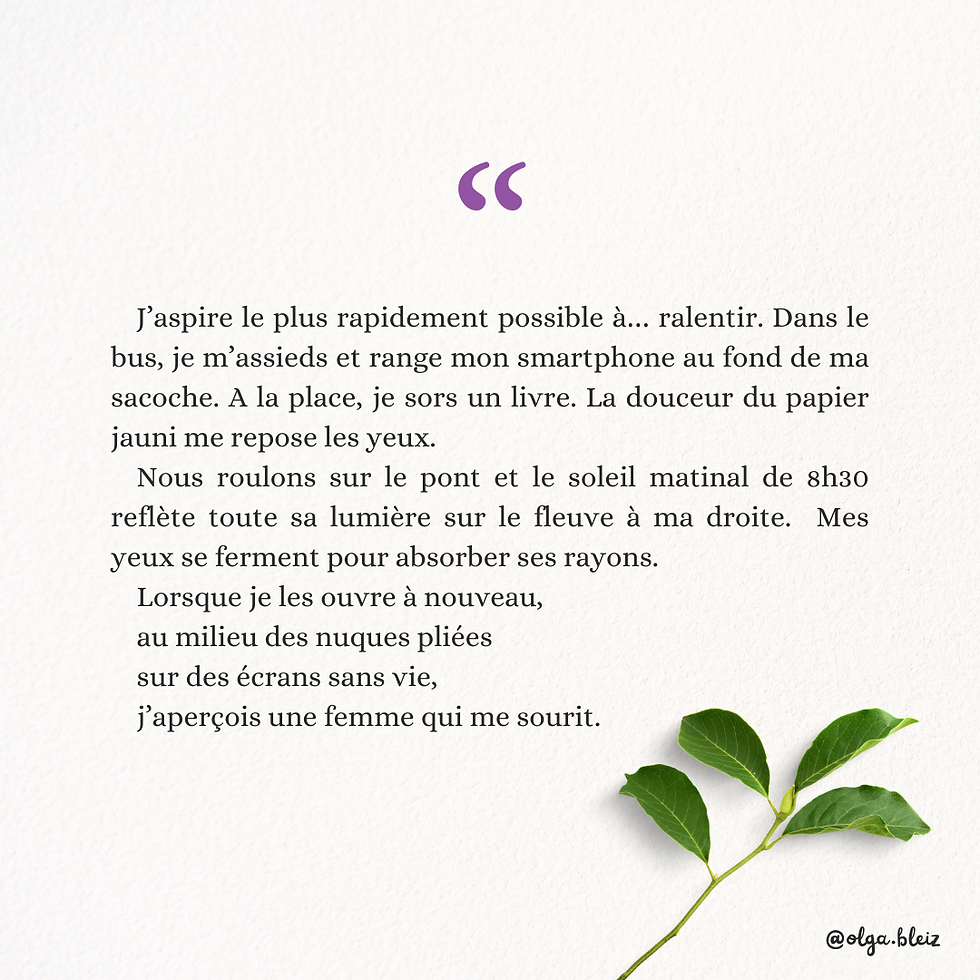 Mais pour la première fois depuis des mois, dans ce bus, j’ai croisé le regard d’une personne qui lisait. Elle a vu mon livre et nous nous sommes souri.